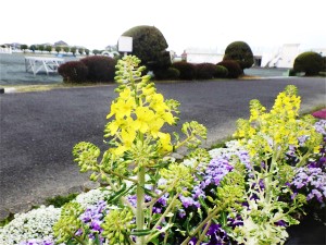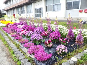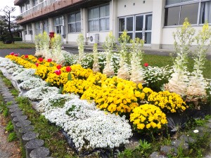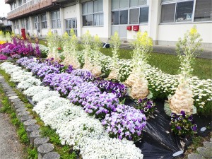 さて、職員室前の花壇の花が満開になっていてとてもきれいです。真ん中の葉ボタンは薹(とう)が立って、その先に小さな花をつけています。
